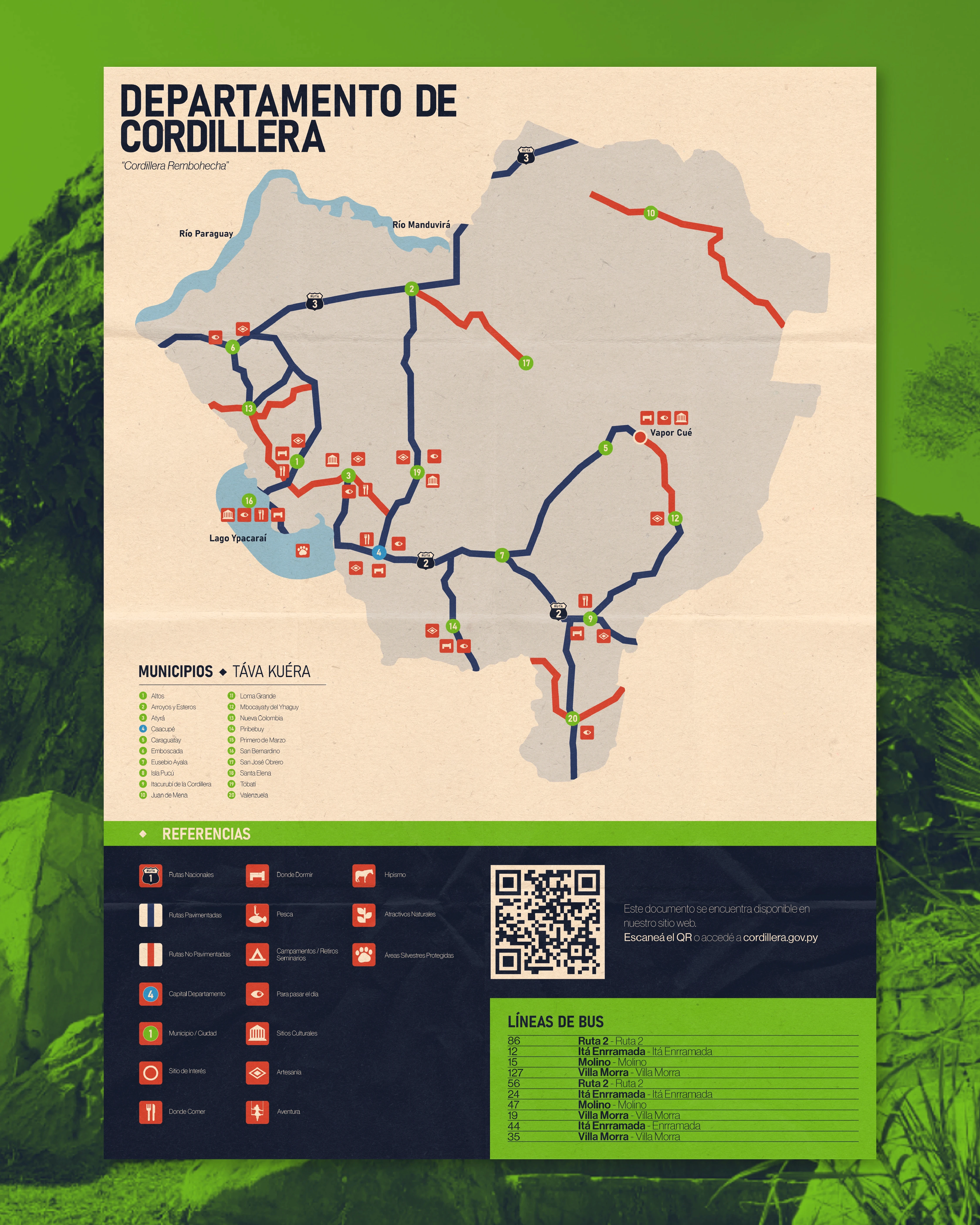 Cordillera, one of the most beautiful states in Paraguay, wanted to reinvent their state brand from the ground up. I had the task to find a new essence, and translate it to the visual world.